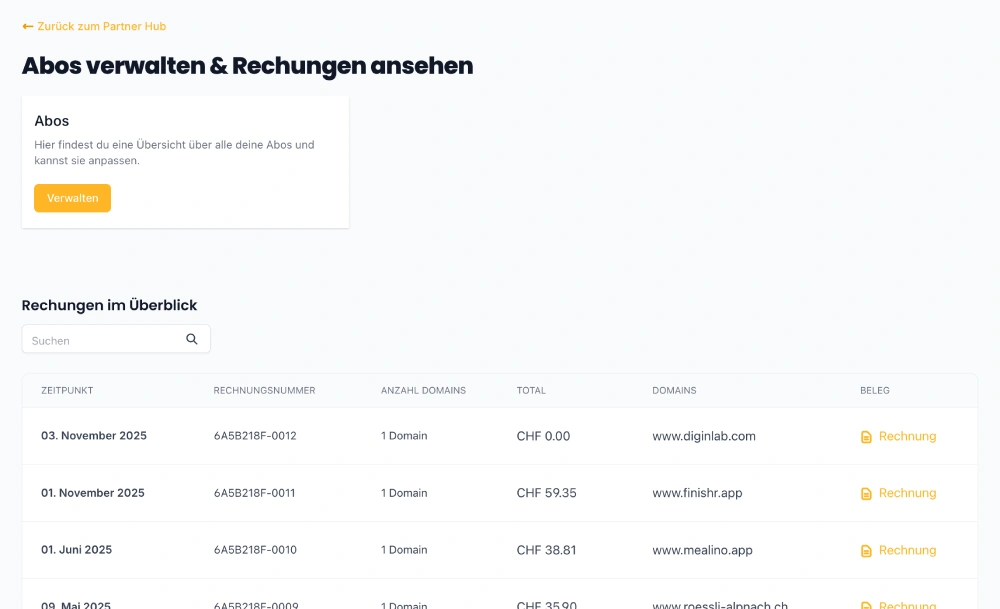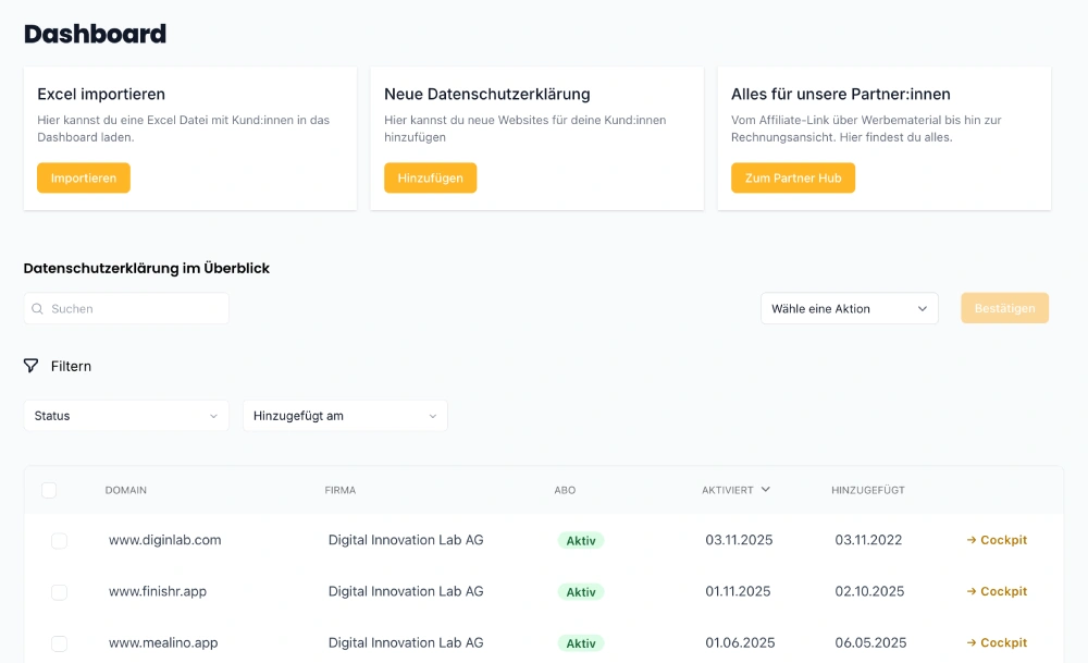 Unser Partnerdashboard ermöglicht es dir rasch und unkompliziert neue Domains zu erfasse, um Datenschutzerklärungen & Cookiebanner auf deinen Kundenwebseiten einzubinden. Behalte stets den Überblick über all deine Projekte.