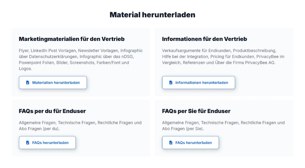 Wir stellen all unseren Partner:innen unser umfangreiches Dossier voller Inhalte für deine Endkunden zur Verfügung. Hier findest du vorgefertigte Vorlagen zur Bewerbung von PrivacyBee wie Newsletter-Texte, fertige LinkedIn-Posts und Fotos.